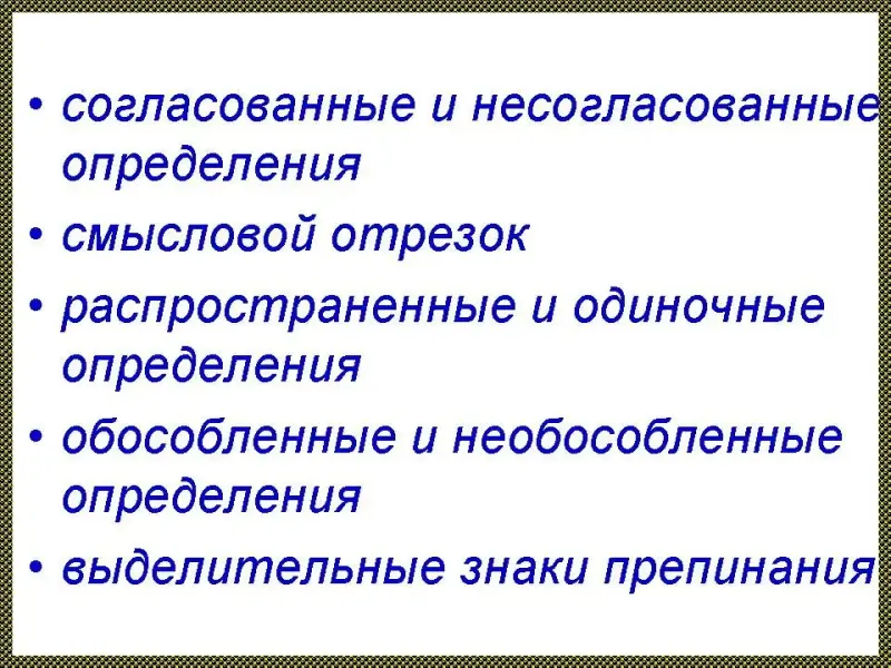 - Назовите ключевые слова урока (смысловой отрезок, согласованные и несогласованные определения, распространенные и одиночные определения,