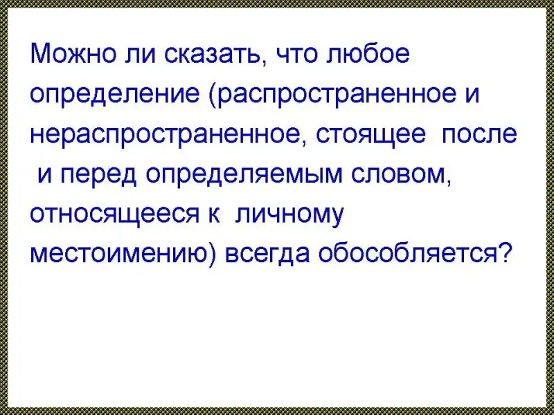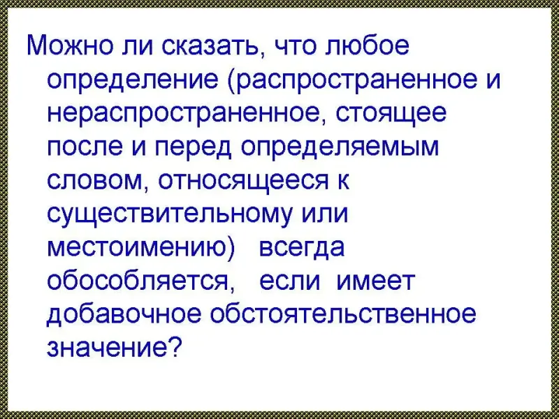 (СЛАЙД № 26). - Можно ли сказать, что любое определение (распространенное и нераспространенное, после и перед определяемым словом, относящееся к существительному и местоимению) всегда обособляется, если имеет добавочное обстоятельственное значение? (Да!)