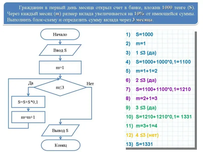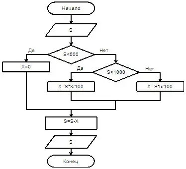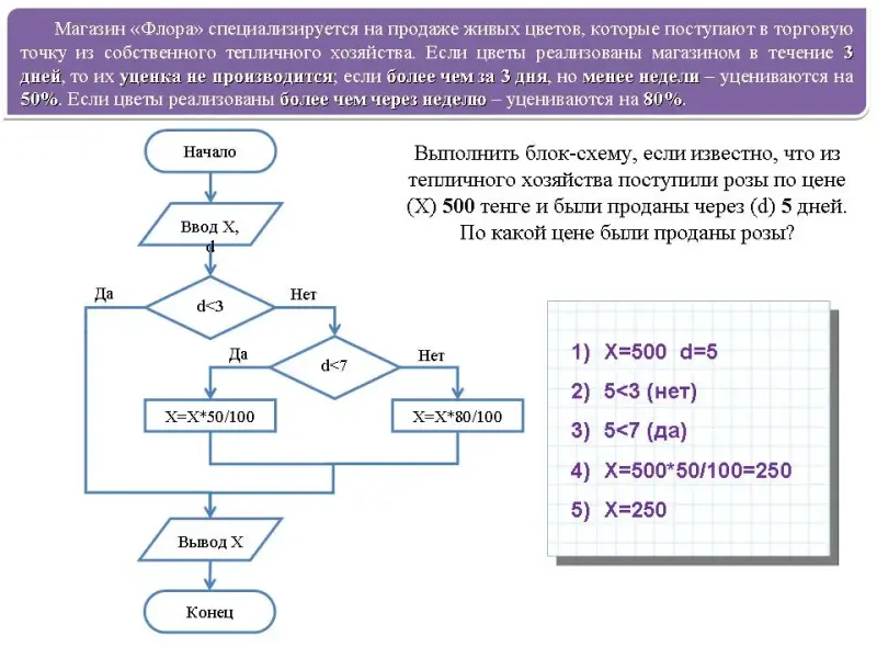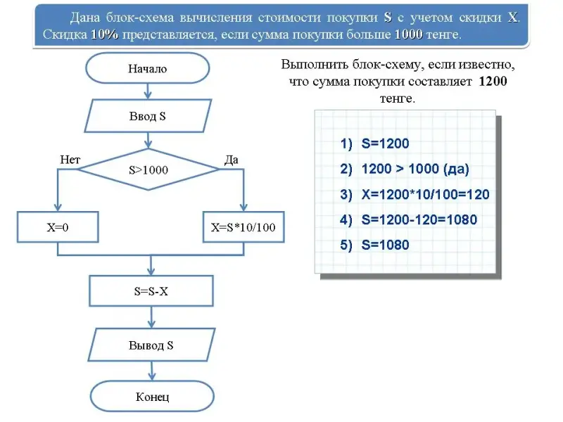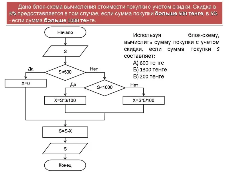 № 1. Дана блок-схема вычисления стоимости покупки с учетом скидки. Скидка в 3% предоставляется в том случае, если сумма покупки больше 500 тенге, в 5% - если сумма больше 1000 тенге.
