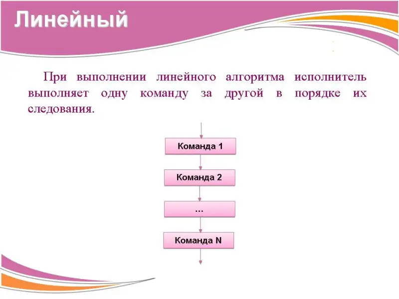 4. Линейный алгоритм. При выполнении линейного алгоритма исполнитель выполняет одну команду за другой в порядке их следования.