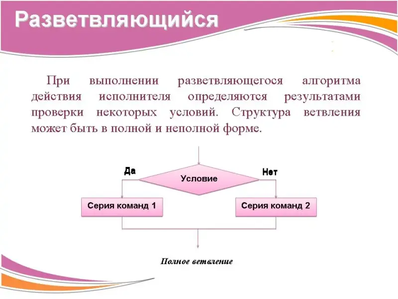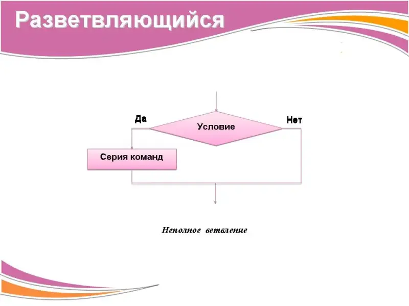 5. Разветвляющийся алгоритм (ветвление). При выполнении разветвляющегося алгоритма действия исполнителя определяются результатами проверки некоторых условий. Структура ветвления может быть в полной и неполной форме.