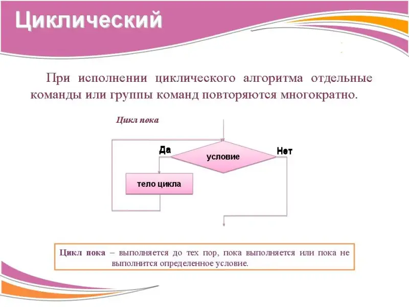 6. Циклический алгоритм. При исполнении циклического алгоритма отдельные команды или группы команд повторяются многократно.
