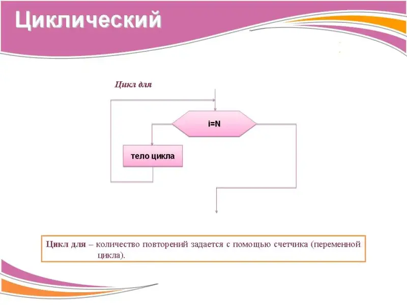 Цикл для - количество повторений задается с помощью счетчика (переменной цикла).