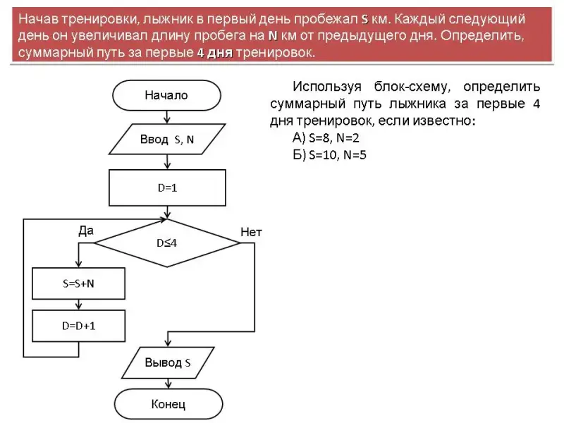 Используя блок-схему, определить суммарный путь лыжника за первые 4 дня тренировок, если известно: