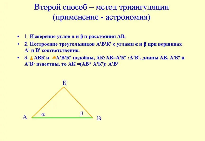 Второй способ, получивший название метода триангуляции, нашел применение в астрономии. С его помощью измерялись расстояния до небесных тел. Этот метод состоит из трех этапов: