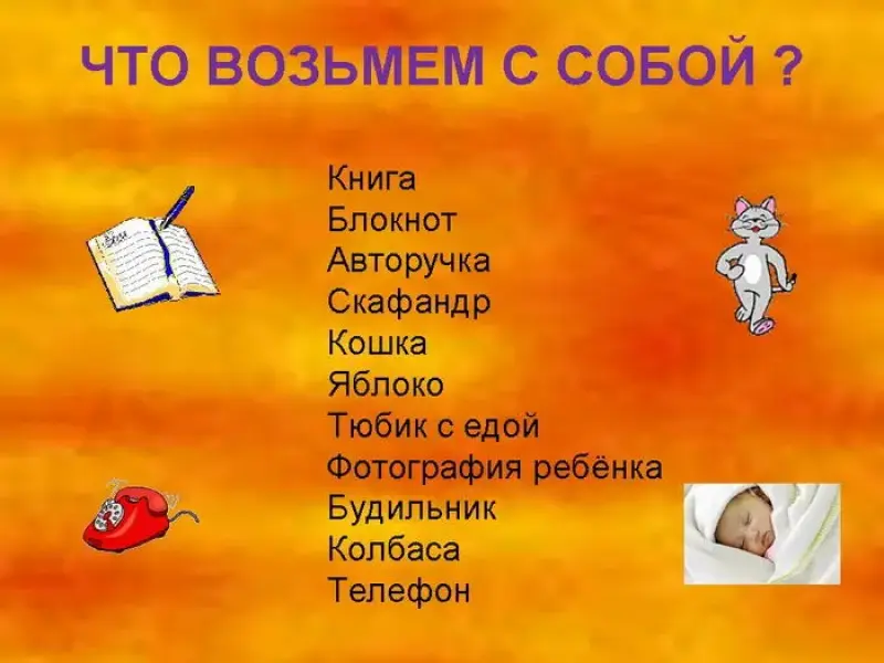 (2 комплекта рисунков: книга, блокнот, авторучка, скафандр, кошка, яблоко, тюбик с едой, фотография ребенка, будильник, колбаса).