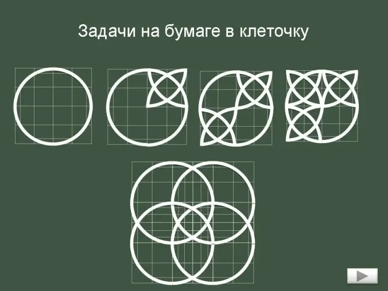 Симметрия окружности. Свойства дуг. Длина окружности и ее частей. Дидактические игры "Длина дуги", "Тригонометрические часы". Задачи на бумаге в клеточку- использование естественного тренажера, который всегда под рукой, именно на бумаге в клеточку удобно возобновляется тригонометр с окружностью радиуса 2 клеточки, где линейки клеточек являются естественными разделителями дуг (нахождение их длин-посильная для восьмиклассника задача)