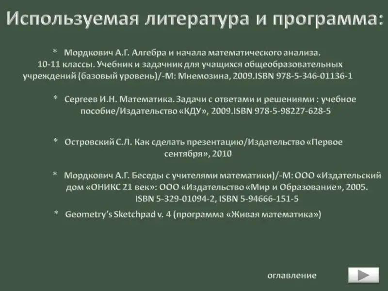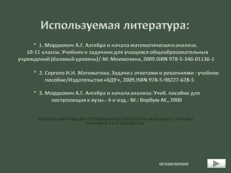 - Мордкович А.Г. Алгебра и начала математического анализа. 10-11-й классы. Учебник и задачник для учащихся общеобразовательных учреждений (базовый уровень)\ - М: Мнемозина, 2009.ISBN 978-5-345-01136-1
