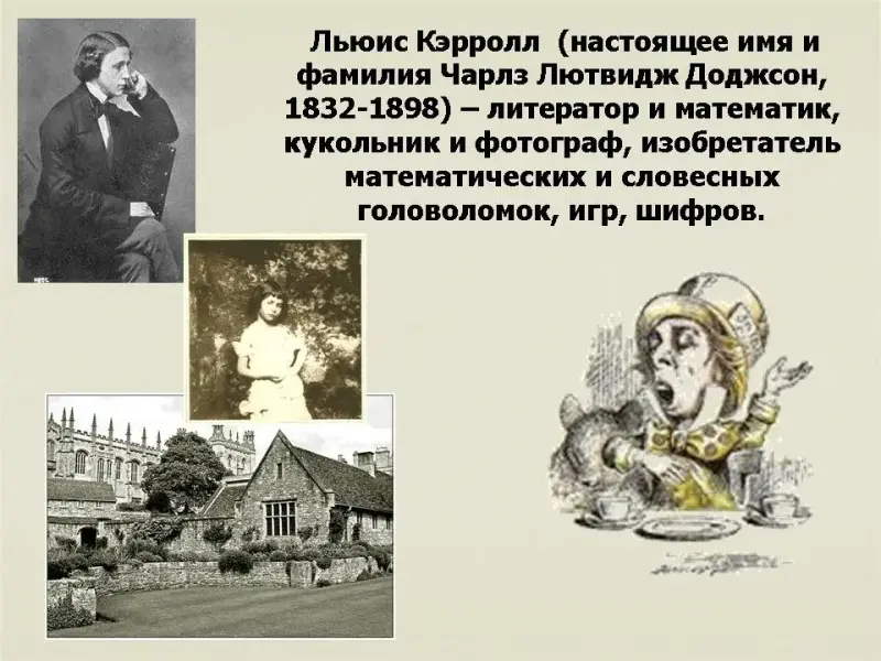 Конечно, это герои Льюиса Кэрролла в его книгах "Алиса в стране чудес", "Алиса в Зазеркалье". В нерасторжимом союзе скромного и несколько чопорного Доджсона и яркого Кэрролла первый явно проигрывал второму: литератор Льюис Кэрролл был лучшим математиком и логиком, чем оксфордский "дон" Чарлз Лютвидж Доджсон. Ребёнком он увлекался кукольным театром, жонглировал и всю жизнь с наслаждением показывал фокусы, особенно детям. Он занялся фотографией на заре этого искусства и фотографировал детей и знаменитостей с удивительным мастерством и вкусом. Он любил всевозможные игры, особенно шахматы, крокет, бильярд. Он изобрёл множество математических и словесных головоломок, игр, шифров. Он придумал и рассказал всему миру о приключениях Алисы, о её встречах с белым кроликом, Додо, шахматной королевой, Шляпником. Именно Шляпник задавал Алисе так много вопросов и загадок.