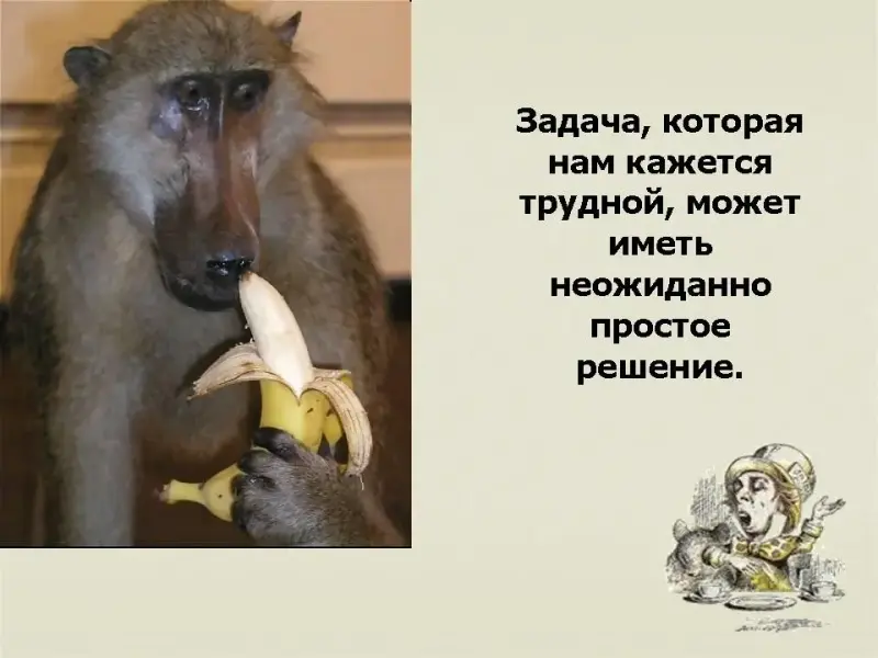 Мораль этой юмористической истории понять нетрудно: задача, которая нам кажется трудной, может иметь неожиданно простое решение. Обезьяна могла руководствоваться природным инстинктом или накопленным опытом, но главное в том, что она сумела найти прямое решение задачи, которое ускользнуло от внимания экспериментатора.