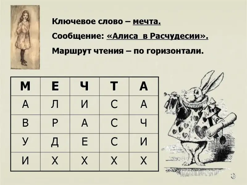 Например, нужно зашифровать сообщение: "Алиса в Расчудесии", ключевое слово - мечта, маршрут чтение - по горизонтали.