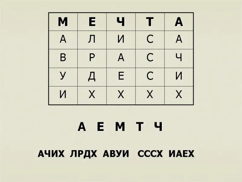 Итак, слово "мечта". Нужно также выбрать маршрут чтения - направление, по которому записываются буквы тайного сообщения под ключевым словом.