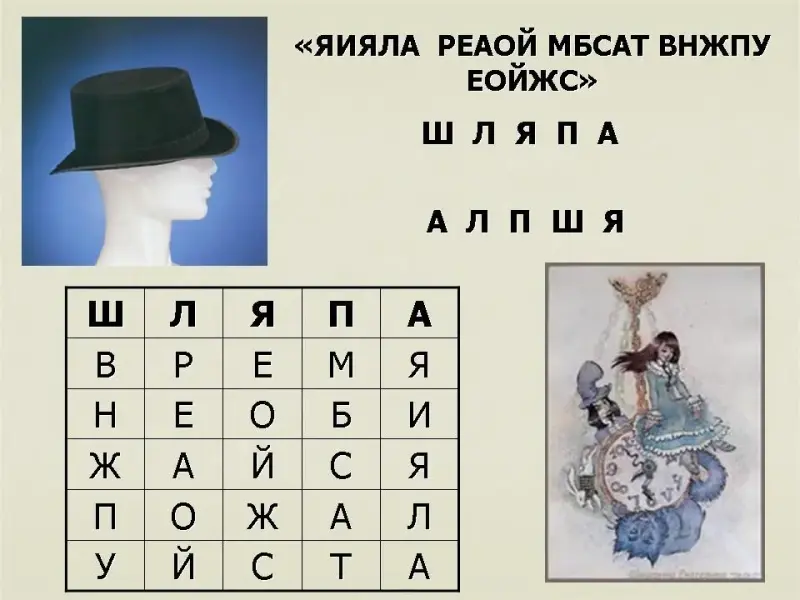 "Конечно же, шляпа!"- воскликнула Алиса. - Попробуем маршрут чтения по горизонтали". Шляпа - а л п ш я.
