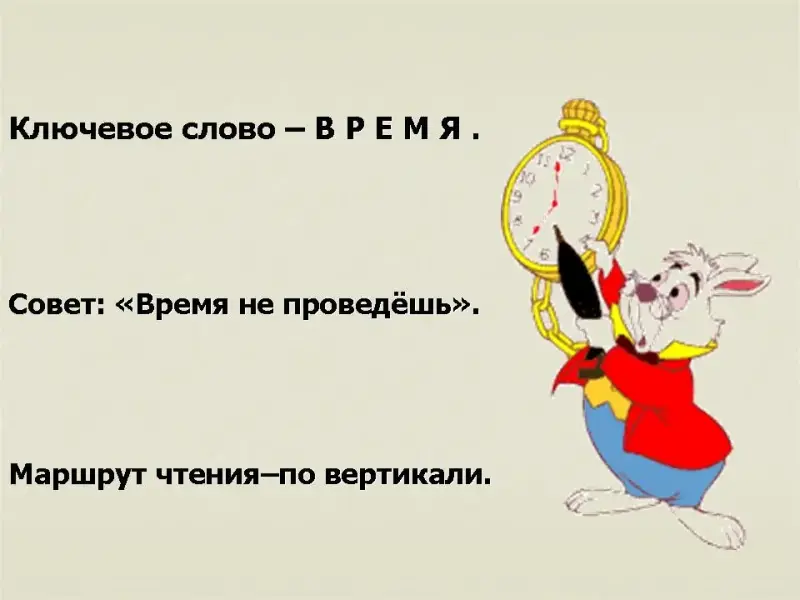 "Ещё один совет я хочу дать, - сказал Шляпник. - Ты, Алиса его зашифруй и вручи Соне. "Время не проведёшь", ключевое слово время, маршрут чтения - по вертикали".