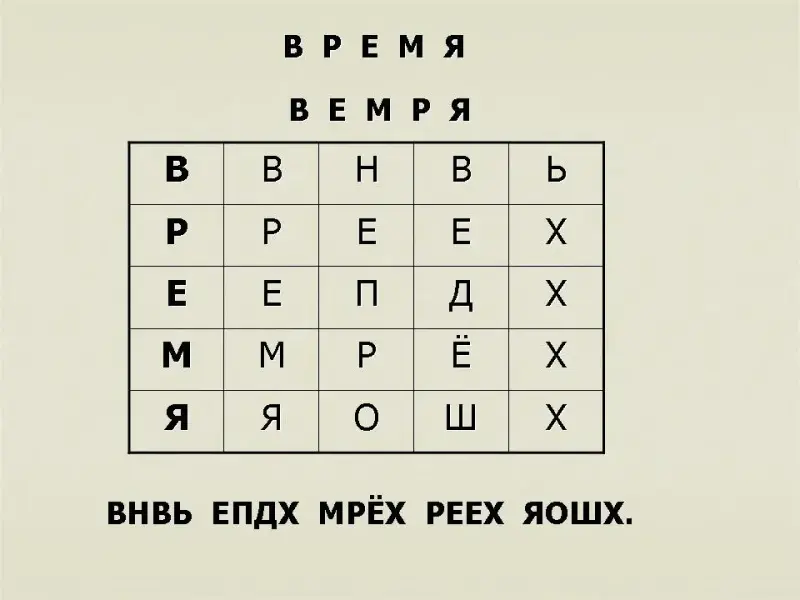 а е м т ч. Значит набор букв, стоящих под "а", составит первое слово сообщения, а набор букв под "е" - второе и т.д. Мы получим следующий текст сообщения: " ачих лрдх авуи сссх иаех". Для того, чтобы усложнить задачу непосвящённым в переписку, можно сообщения записывать не четвёрками, а сплошным текстом. Тогда получатель должен сам поделить количество букв сообщения на 5 (число букв ключевого слова) и получить необходимые четвёрки, тройки, шестёрки… Количество букв в столбце зависит от длины послания.