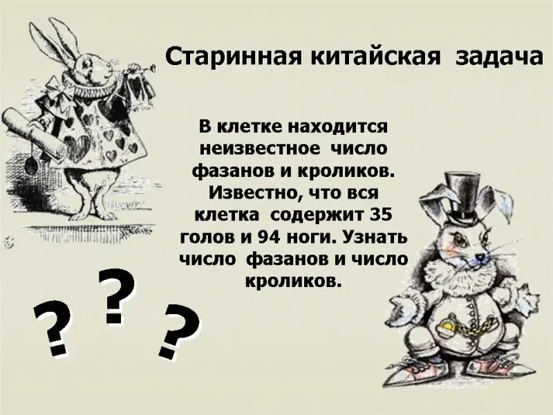 Давайте вернёмся в Страну Чудес: путешествие ещё не закончено. Не все гости выступили со своими задачами. Например, белый кролик. Ему мы посвятим старинную китайскую задачу.