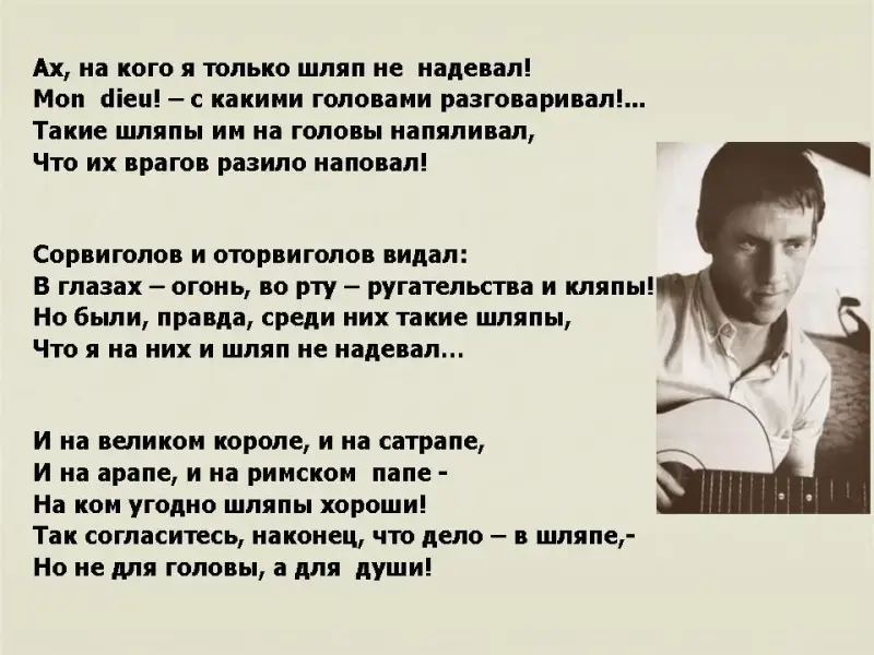 Ах, эти шляпы, эти шляпы… Большие, маленькие, чёрные, белые, да разве не всё ли равно какие, главное - на какую голову надеты: что в этой голове? Какое содержание, какие мысли? Какие вопросы?