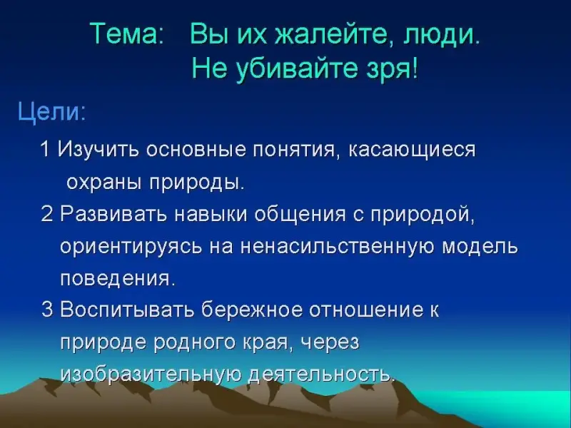 - Развивать у детей навыки общения с природой, ориентируясь на ненасильственную модель поведения.