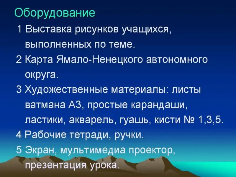 - Художественные материалы: листы ватмана А3, простые карандаши, ластики, акварель, гуашь, кисти № 2,4,6.