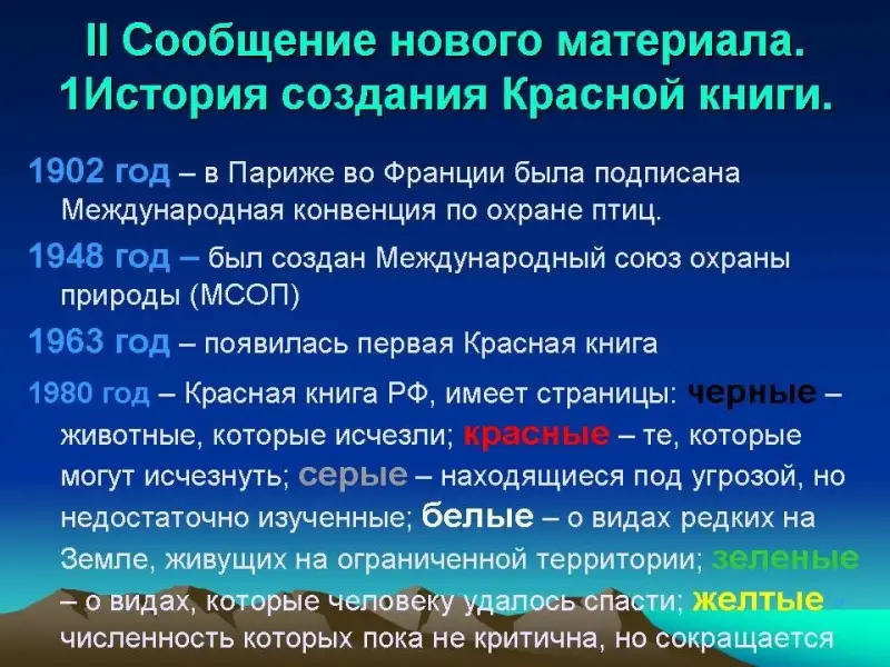 1980 год - Красная книга РФ - является документом, содержащим свод сведений о редких и исчезающих видах животных и растений, а также меры по их охране и восстановлению. В ней перечисляются животные и растения, которые могут исчезнуть. Спасение их невозможно без специальных мер: запрета охоты, охраны в заповеднике, заботы об их размножении.
