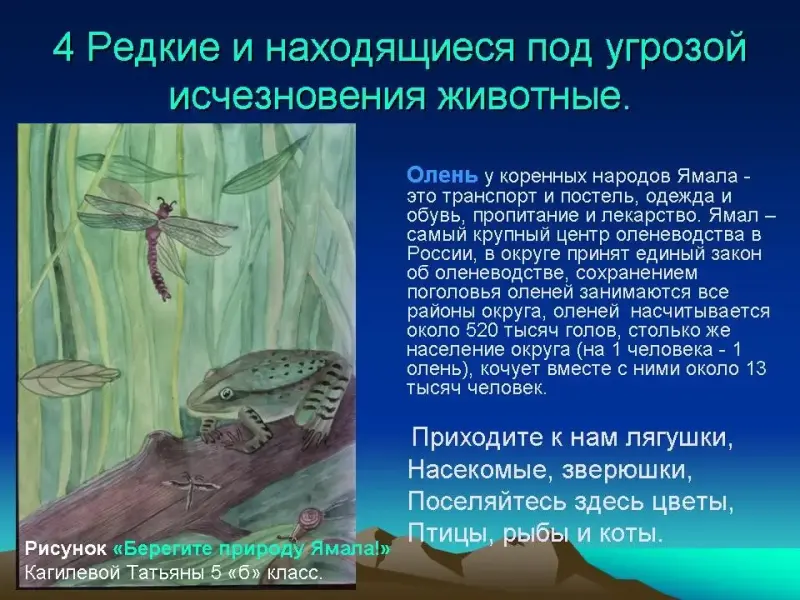 - Жизнь человека на Земле прочно связана с животными. Они давали людям пищу, одежду, внушали страх и приносили радость, они порождали обычаи, влияли на весь уклад жизни, как, например, олень у коренных народов Ямала. Это транспорт и постель, одежда и обувь, пропитание и лекарство, которое готовят с пантов оленя, используют для жертвоприношения. Поэтому очень важно знать, любить и беречь животных. Ямал - самый крупный центр оленеводства в России, в округе принят единый закон об оленеводстве, сохранением поголовья оленей занимаются все районы округа, оленей насчитывается около 520 тысяч голов, примерно столько же население округа, т.е. на 1 человека приходится 1 олень, кочует вместе с ними около 13 тысяч человек.изнь человека на Земле прочно связана с животными. пят печь. емле)приход весны? Люди думают, что природа неисчерпаема, сколько ни бери, все снова само с собой восстановится. Но они ошибаются: некоторых животных совсем истребили, а некоторые находятся под угрозой исчезновения. Это значит, что они тоже могут погибнуть. Хозяйственная деятельность людей является жизненной необходимостью, целенаправленное и бессмысленное истребление животных оправдания не имеет. К охоте человек пристрастился с древних времен, добывая пропитание. Но когда человек начал заниматься земледелием, научился разводить домашний скот, охота начала терять свой первоначальный смысл. Она становилась развлечением, спортом, отдыхом. И вот такая охота приводит к полному исчезновению животных. 8 ученик: читает стихотворение.