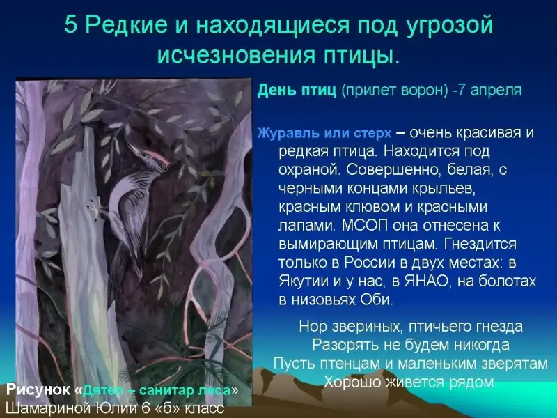 Журавль или стерх - очень красивая и редкая птица. Находится под охраной. Совершенно, белая, с черными концами крыльев, с красными клювом и лапами. МСОП она отнесена к вымирающим птицам. Гнездится только в России в двух местах: в Якутии и у нас, в ЯНАО, на болотах в низовьях Оби (демонстрируется иллюстрация со стерхом).