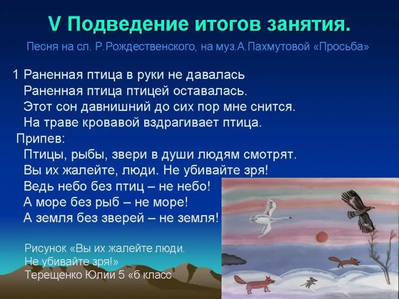 Занятие заканчивается песней на слова Р.Рождественского, на музыку А.Пахмутовой "Просьба", выученной на уроке музыки.