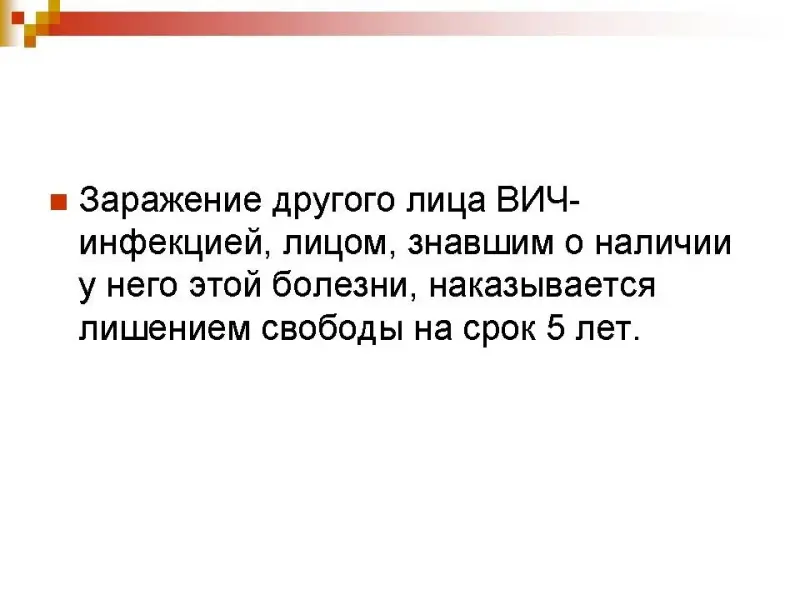 - Заражение другого лица ВИЧ-инфекцией, лицом, знавшим о наличии у него этой болезни, наказывается лишением свободы на срок 5 лет.