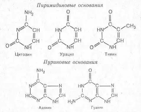 а - урацил; б - аденин; в - гуанин; г - цитозин.
