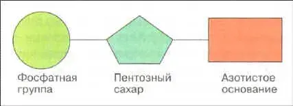 а - азотистые основания; б - остатки пентоз; в - остатки фосфорной кислоты;