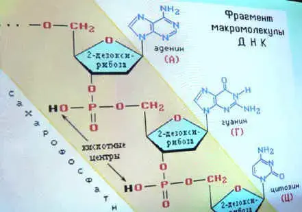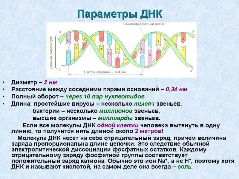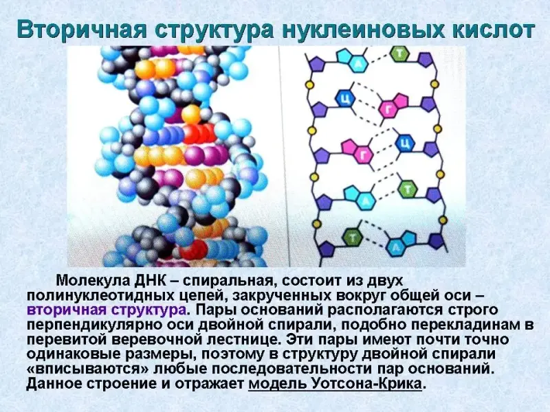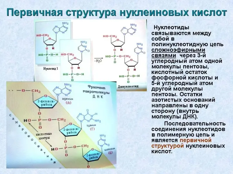Остатки азотистых оснований направлены в одну сторону (внутрь молекулы ДНК). Последовательность соединения нуклеотидов в полимерную цепь и является первичной структурой нуклеиновых кислот.