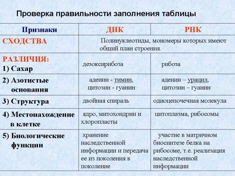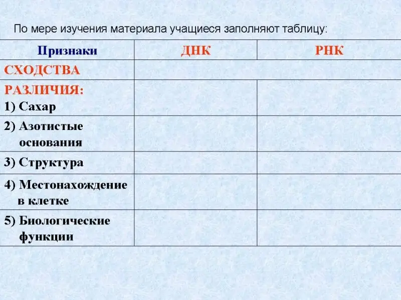 По мере изучения материала учащиеся заполняют таблицу (Слайд 5), в которой отражены признаки сходства и различия ДНК и РНК (дан заполненный вариант таблицы). Данная таблица является обобщающим материалом темы.