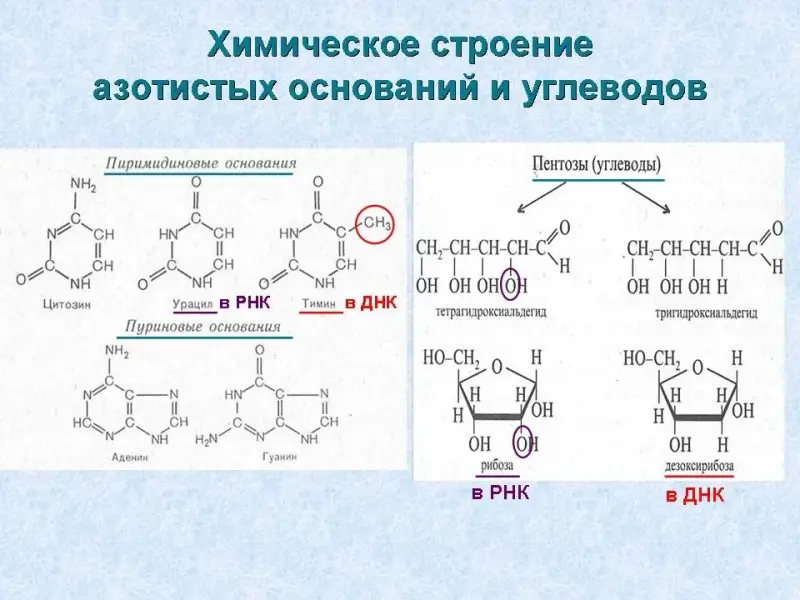Учащиеся самостоятельно, с использованием рисунка учебника и слайда презентации, находят отличия в строении тимина и урацила (в тимине есть метильный радикал СН3-), рибозы и дезоксирибозы (на отличие указывает название - "дезокси" - отнятие одного атома кислорода) и заполняют графы сравнительной таблицы.