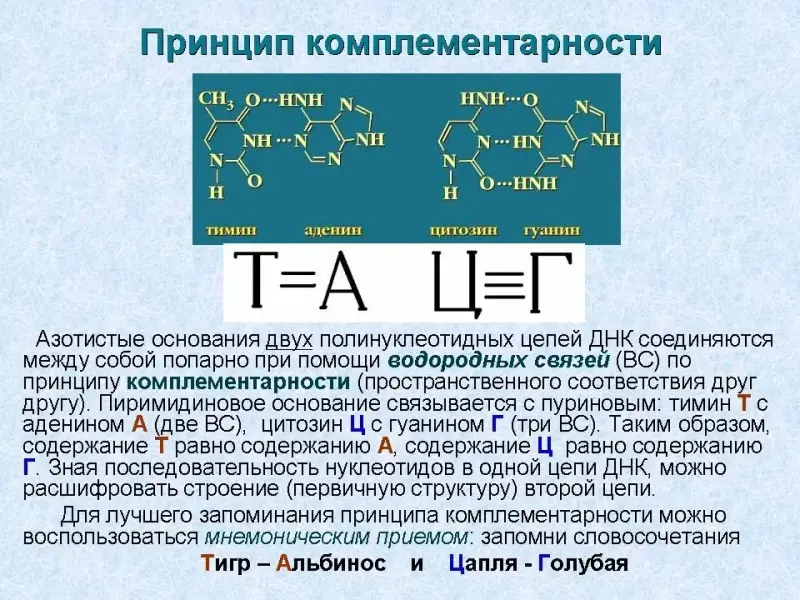Азотистые основания соединяются между собой по принципу комплементарности (Слайд 10), т.е. пространственного соответствия друг другу, - пуриновое основание с пиримидиновым. Аденин образует с тимином - 2 ВС, гуанин с цитозином - 3 ВС. Это обеспечивает равномерность в построении всей вторичной структуры ДНК. Для лучшего запоминания принципа комплементарности можно воспользоваться мнемоническим приемом - запомнить словосочетания: Тигр - Альбинос, Цапля - Голубая.