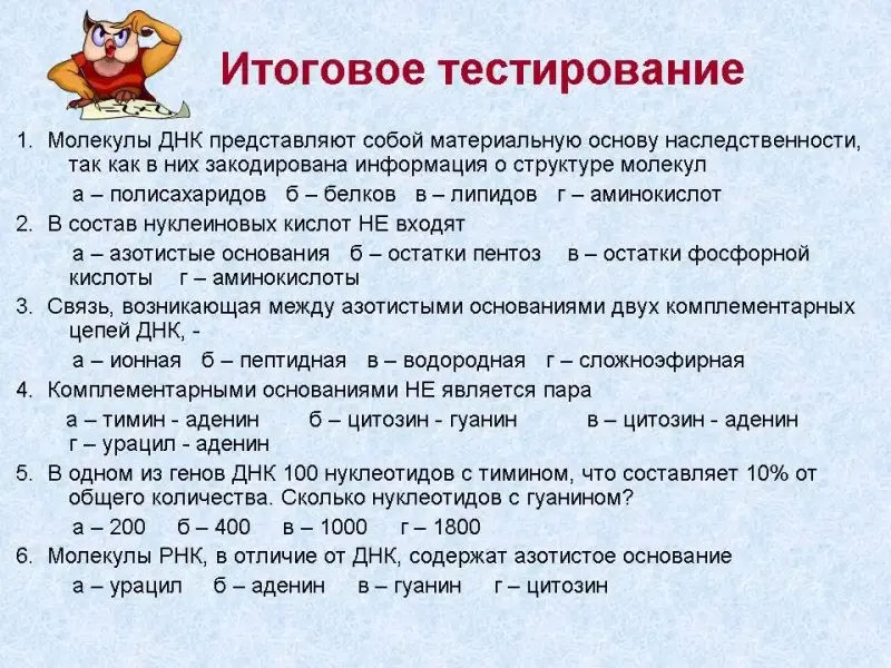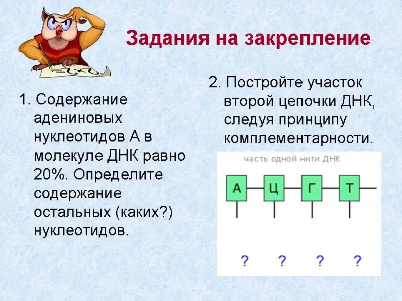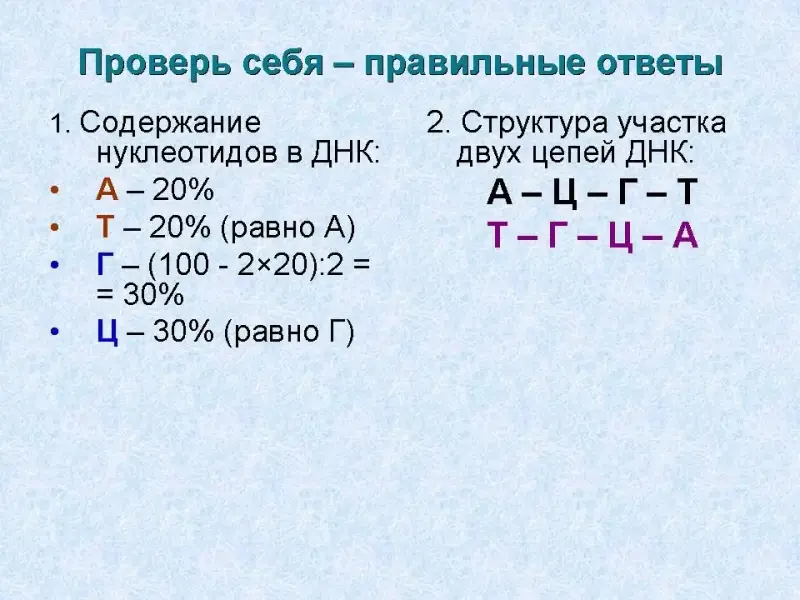 1. Содержание адениновых нуклеотидов А в молекуле ДНК равно 20%. Определите содержание остальных (каких?) нуклеотидов.