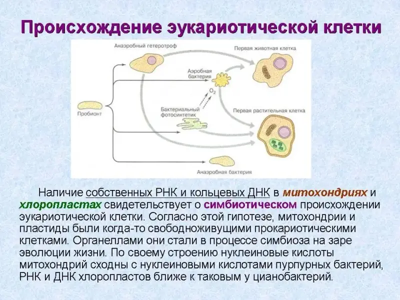Наличие собственных РНК и кольцевых ДНК в митохондриях и хлоропластах свидетельствует о симбиотическом происхождении эукариотической клетки. (Слайд 23) Согласно этой гипотезе, митохондрии и пластиды были когда-то свободноживущими прокариотическими клетками. Органеллами они стали в процессе симбиоза на заре эволюции жизни. По своему строению нуклеиновые кислоты митохондрий сходны с нуклеиновыми кислотами пурпурных бактерий, РНК и ДНК хлоропластов ближе к таковым у цианобактерий.
