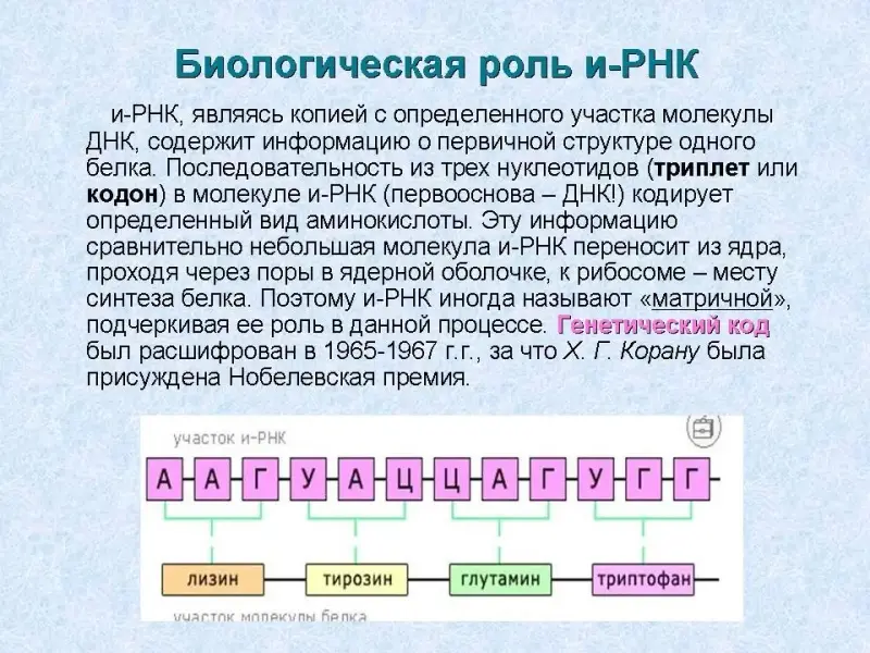 - информационная (матричная) - и-РНК (0,5-1% всех РНК клетки). (Слайд 24) Являясь копией с определенного участка молекулы ДНК, и-РНК содержит информацию о первичной структуре одного белка. Последовательность из трех нуклеотидов (триплет или кодон) в молекуле и-РНК (первооснова - ДНК!) кодирует определенный вид аминокислоты. Эту информацию сравнительно небольшая молекула и-РНК переносит из ядра, проходя через поры в ядерной оболочке, к рибосоме - месту синтеза белка.