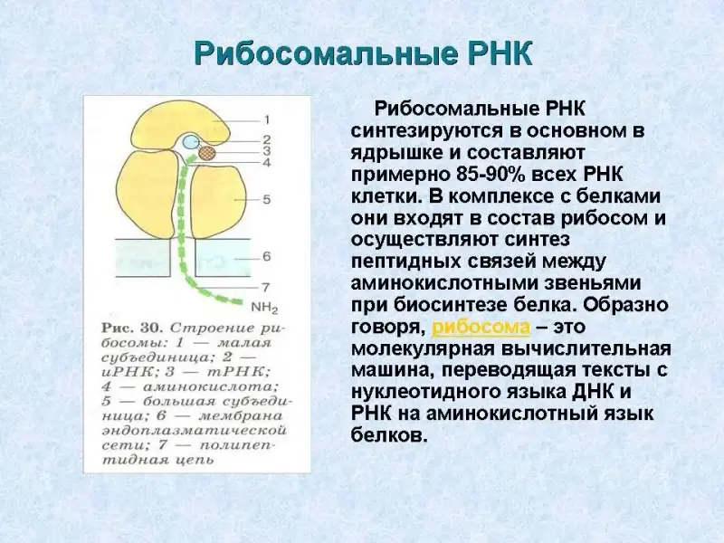 - рибосомальная РНК - р-РНК. Синтезируются в основном в ядрышке и составляют примерно 85-90% всех РНК клетки. (Слайд 26) В комплексе с белками они входят в состав рибосом и осуществляют синтез пептидных связей между аминокислотными звеньями при биосинтезе белка.