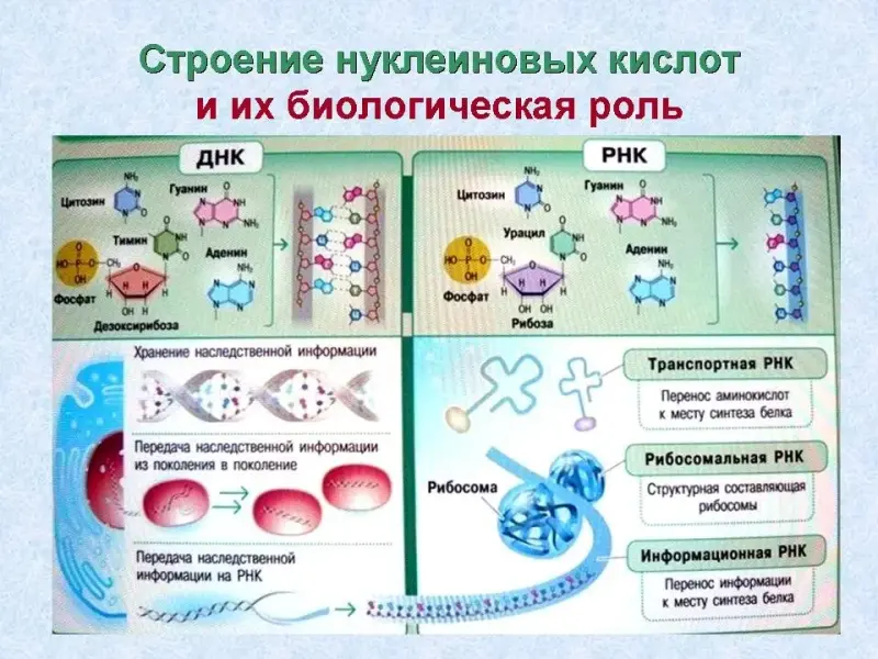 | 5. Биологические функции | хранение наследственной информации и передача ее из поколения в поколение | участие в матричном биосинтезе белка на рибосоме, т.е. реализация наследственной информации |
