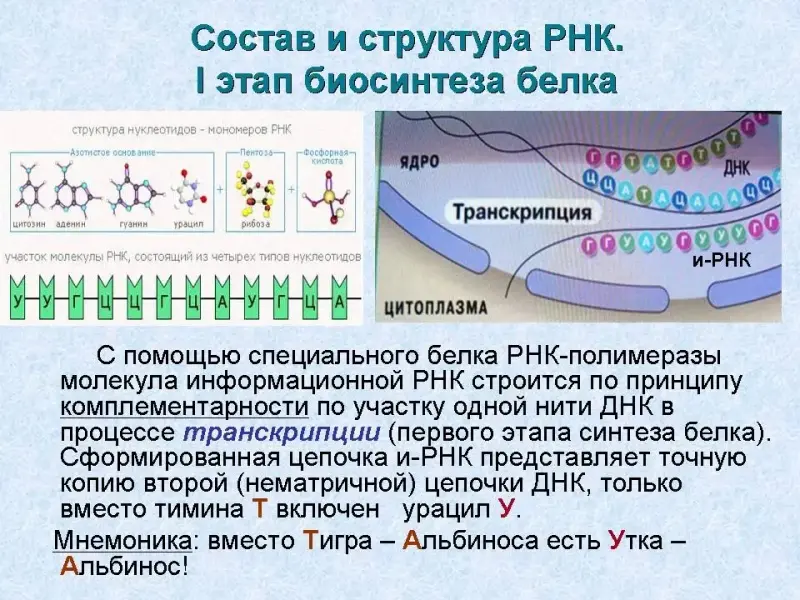 Необходимо напомнить, что вместо тимина в РНК содержится урацил (мнемоника: вместо Тигра-Альбиноса в РНК строится Утка-Альбинос)