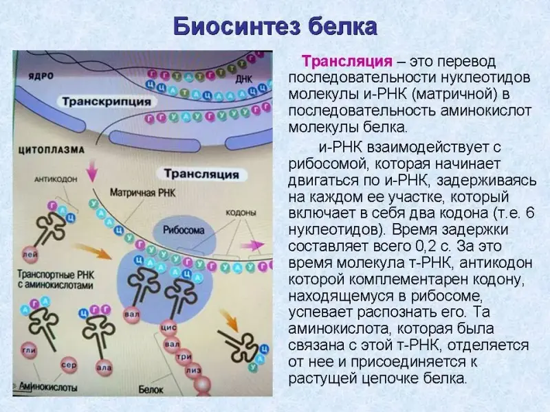 Трансляция - это перевод последовательности нуклеотидов молекулы и-РНК (матричной) в последовательность аминокислот молекулы белка. и-РНК взаимодействует с рибосомой, которая начинает двигаться по и-РНК, задерживаясь на каждом ее участке, который включает в себя два кодона (т.е. 6 нуклеотидов). Время задержки составляет всего 0,2 с. За это время молекула т-РНК, антикодон которой комплементарен кодону, находящемуся в рибосоме, успевает распознать его. Та аминокислота, которая была связана с этой т-РНК, отделяется от нее и присоединяется к растущей цепочке белка. Синтез пептидных связей осуществляется под влиянием р-РНК, которые в комплексе с белками входят в состав рибосом. Завершение синтеза белка на рибосоме кодирует специальный стоп-кодон. Белковая молекула отсоединяется от рибосомы, выходит в цитоплазму и формирует присущую этому белку вторичную, третичную и четвертичную структуру. Все описываемые реакции происходят очень быстро. Подсчитано, что на синтез крупной молекулы белка уходит всего около двух минут. Одновременно к одной молекуле иРНК может присоединиться несколько рибосом - образуется полисома. В результате сразу синтезируется не одна, а несколько молекул данного белка.
