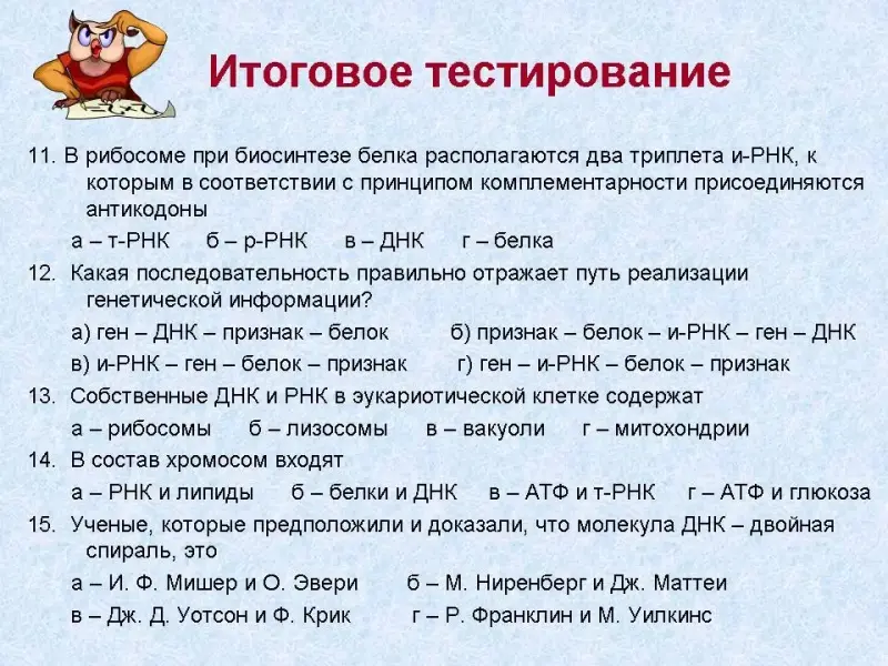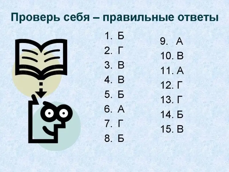 Правильные ответы (Слайд 35): 1б, 2г, 3в, 4в, 5б, 6а, 7г, 8б, 9а, 10в, 11а, 12г, 13г, 14б, 15в.