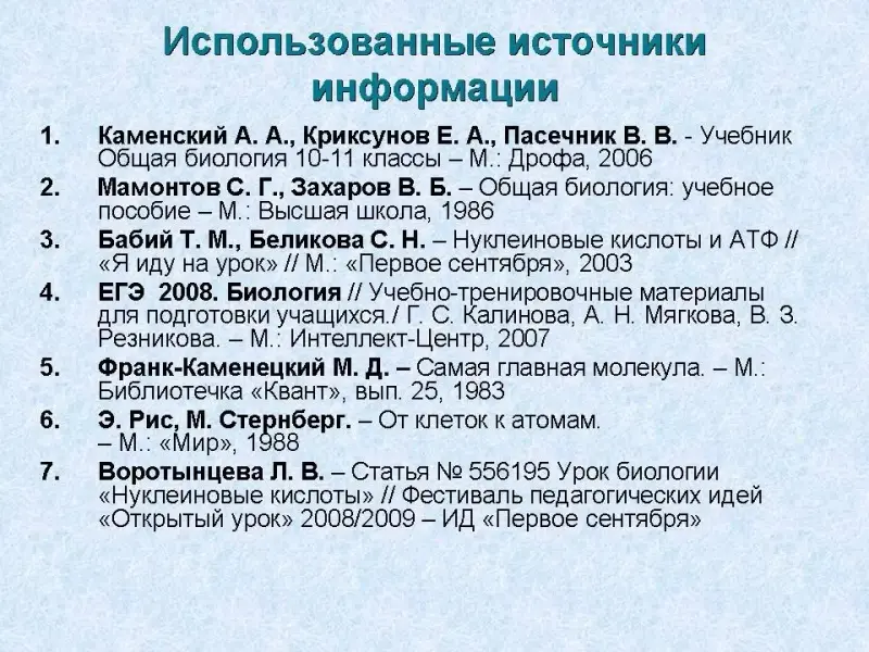 - Бабий Т. М., Беликова С. Н. - Нуклеиновые кислоты и АТФ // "Я иду на урок" // М.: "Первое сентября", 2003.