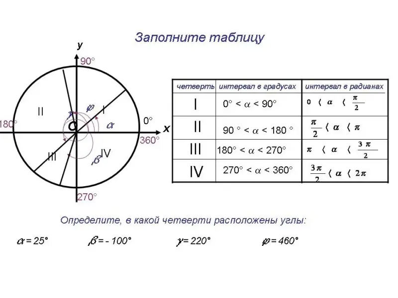Определить градусные и радианные интервалы всех четвертей.
