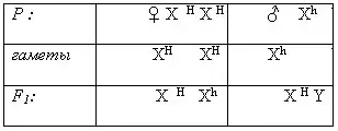 1) Мать имеет нормальную свертываемость крови и является гомозиготной по этому признаку (XH ХH),отец страдает гемофилией (Хh Y) тогда схема скрещивания: