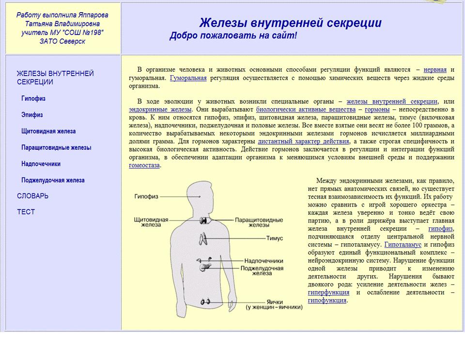 Используя программу «Microsoft FrontPage», я создала электронное интерактивное пособие по биологии на тему «Железы внутренней секреции», который опубликован на областном Интернет-портале «Школьная планета» (http://planeta.edu.tomsk.ru/fi…).