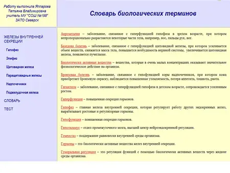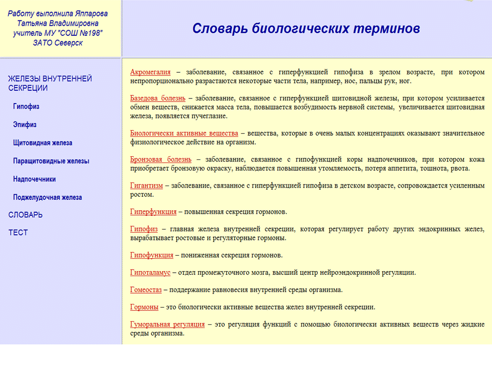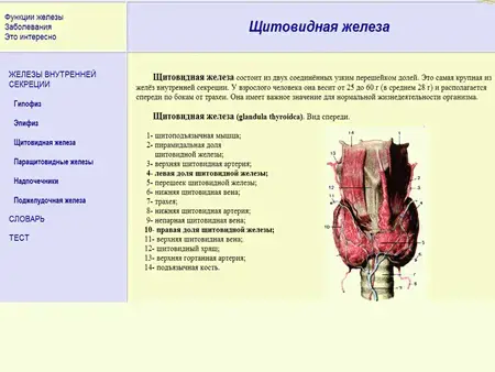Кроме того, web-страницы (экраны) о гипофизе, эпифизе, надпочечниках, а также о щитовидной, паращитовидных и поджелудочной железах содержат приложения: «Функции железы», «Заболевания», «Это интересно».
