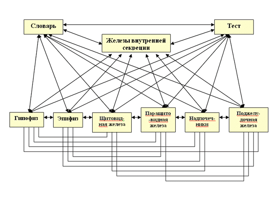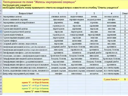 После изучения материалов пособия предлагается пройти тестирование по теме «Железы внутренней секреции». Тест составлен на основе программы «Microsoft Excel» и состоит из 20 вопросов: 17 вопросов из школьной программы и 3 вопроса из дополнительного материала: требуется знать гормоны эпифиза и паращитовидных желез; заболевание, связанное с гипофункцией надпочечников.